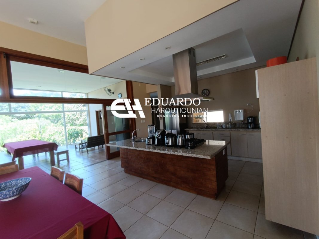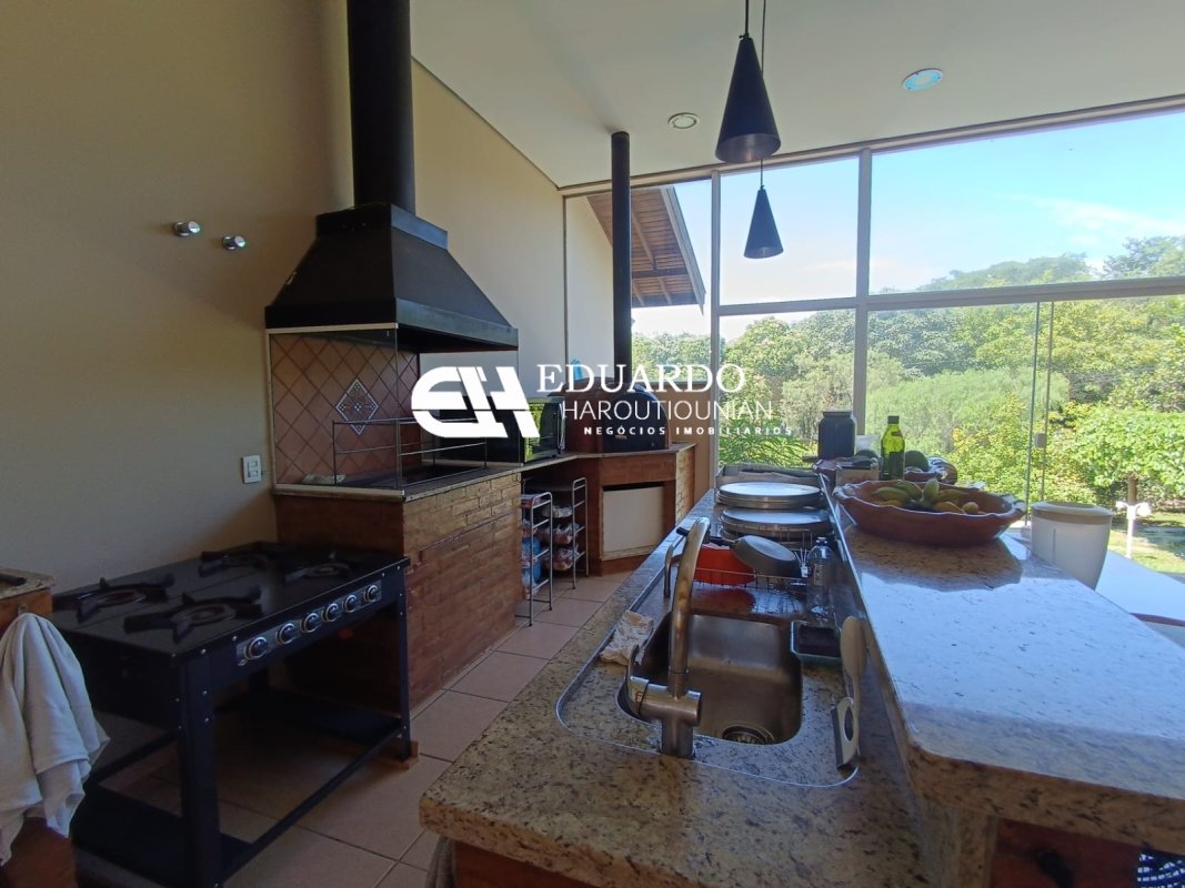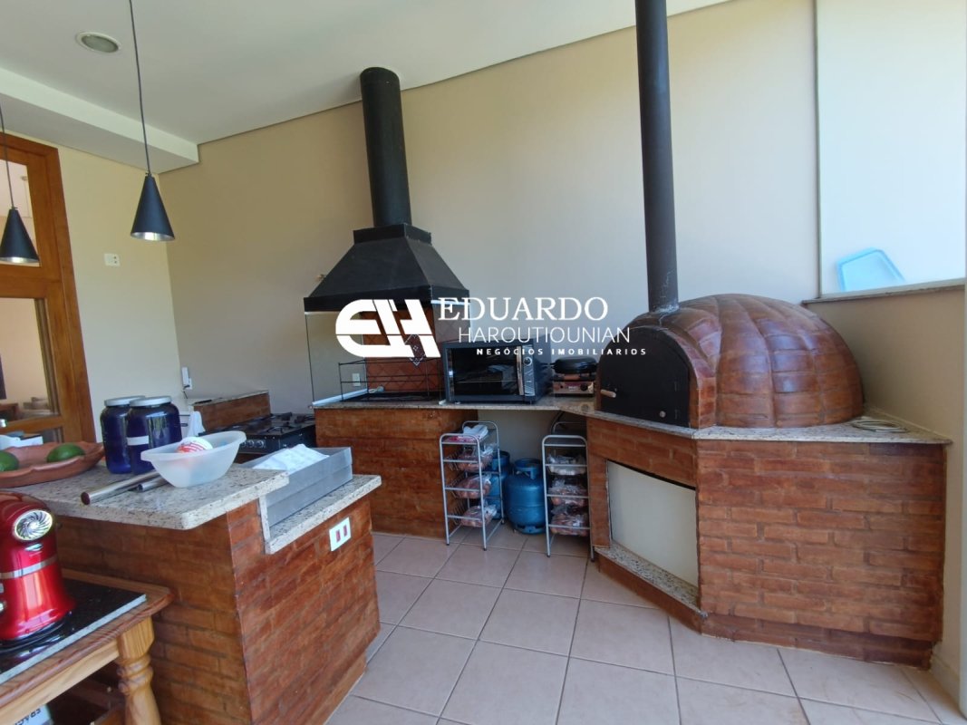 Área gourmet completa com churrasqueira, forno de pizza e estrutura impecável.